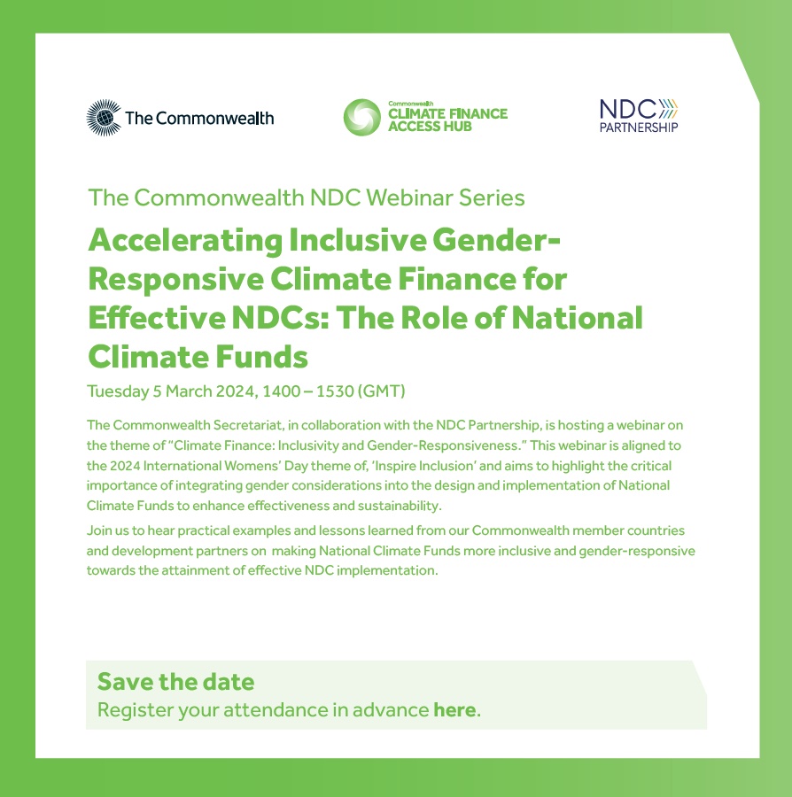The Commonwealth Secretariat, in collaboration with the NDC Partnership, is hosting a webinar on the theme of "Climate Finance: Inclusivity and Gender-Responsiveness." This webinar is aligned to the 2024 International Womens’ Day theme of, ‘Inspire Inclusion’ and aims to highlight the critical importance of integrating gender considerations into the design and implementation of National Climate Funds to enhance effectiveness and sustainability.