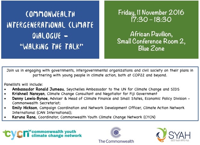 On Friday 11 November, the Commonwealth Youth Climate Change Network hosts an intergenerational panel dialogue in the margins of the COP22 global climate talks in Marrakech, Morocco.
