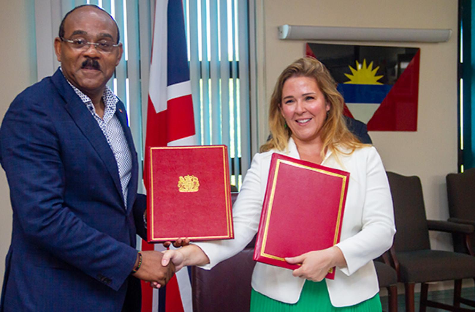 Image caption: Antigua & Barbuda’s Prime Minister Gaston Browne and Resident British High Commissioner Lindsy Thompson at the signing ceremony