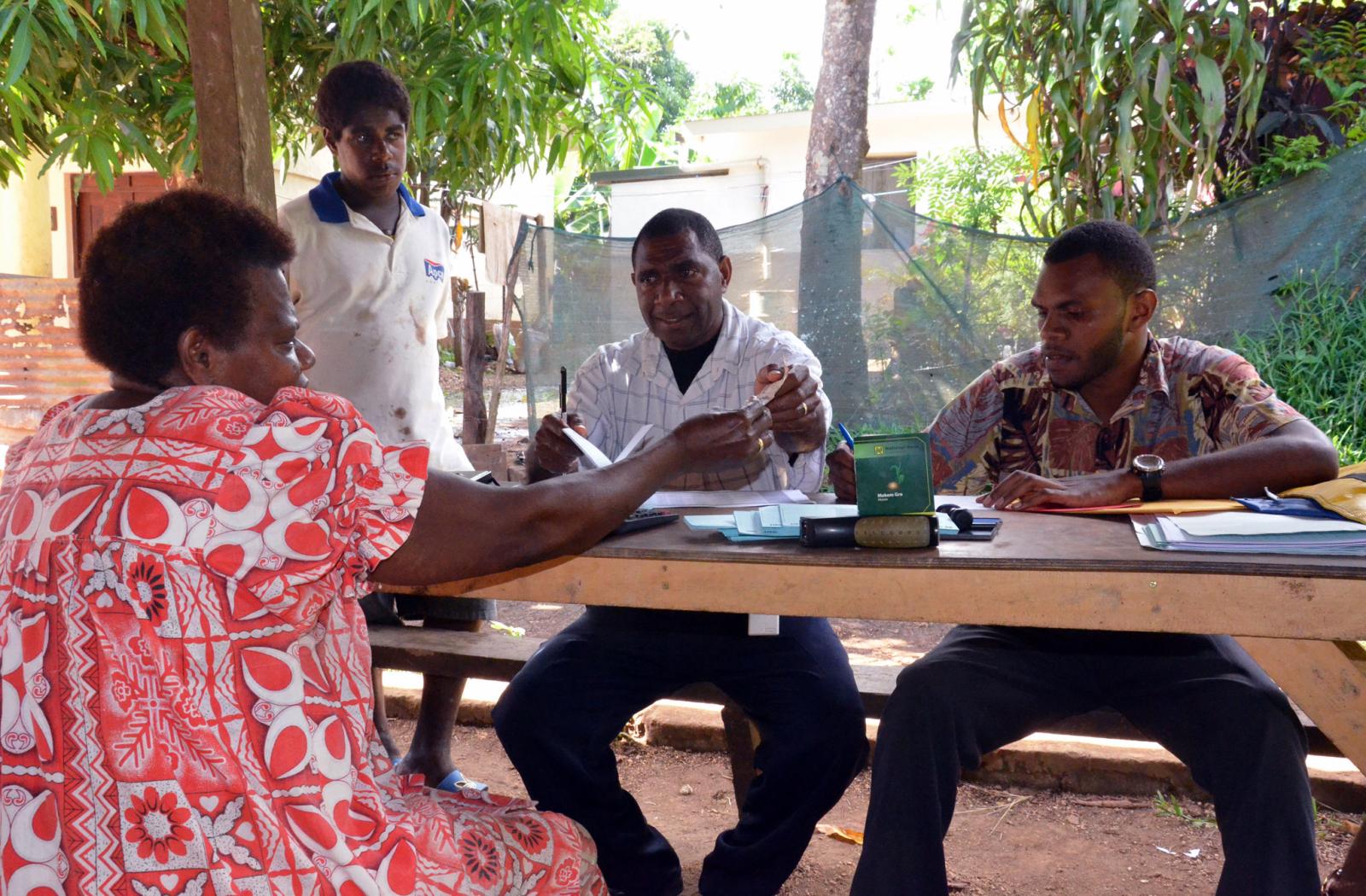 National Bank of Vanuatu employees Mark Solomon and Willie Loughman collect savings and open new bank accounts in Ohlen Mataso village, about 15 kilometres from Port Vila, the capital.