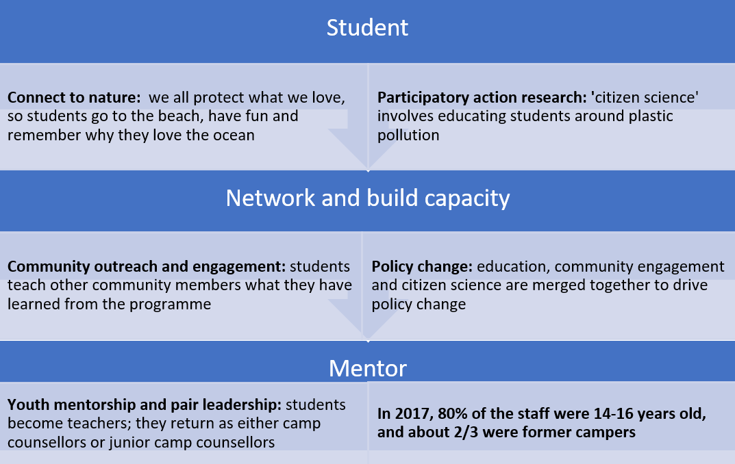 The Bahamas Plastic Movement’s theory of change shows how graduated students come back into the programme to share their knowledge with other students.