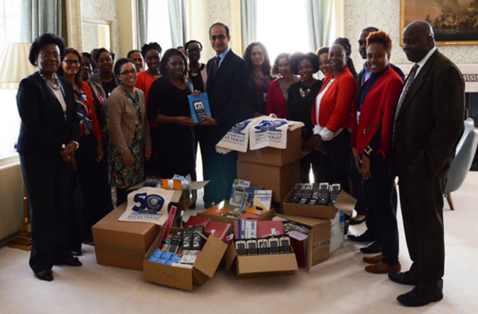 Commonwealth Caribbean community presents donation of school supplies to High Commission of Dominica.