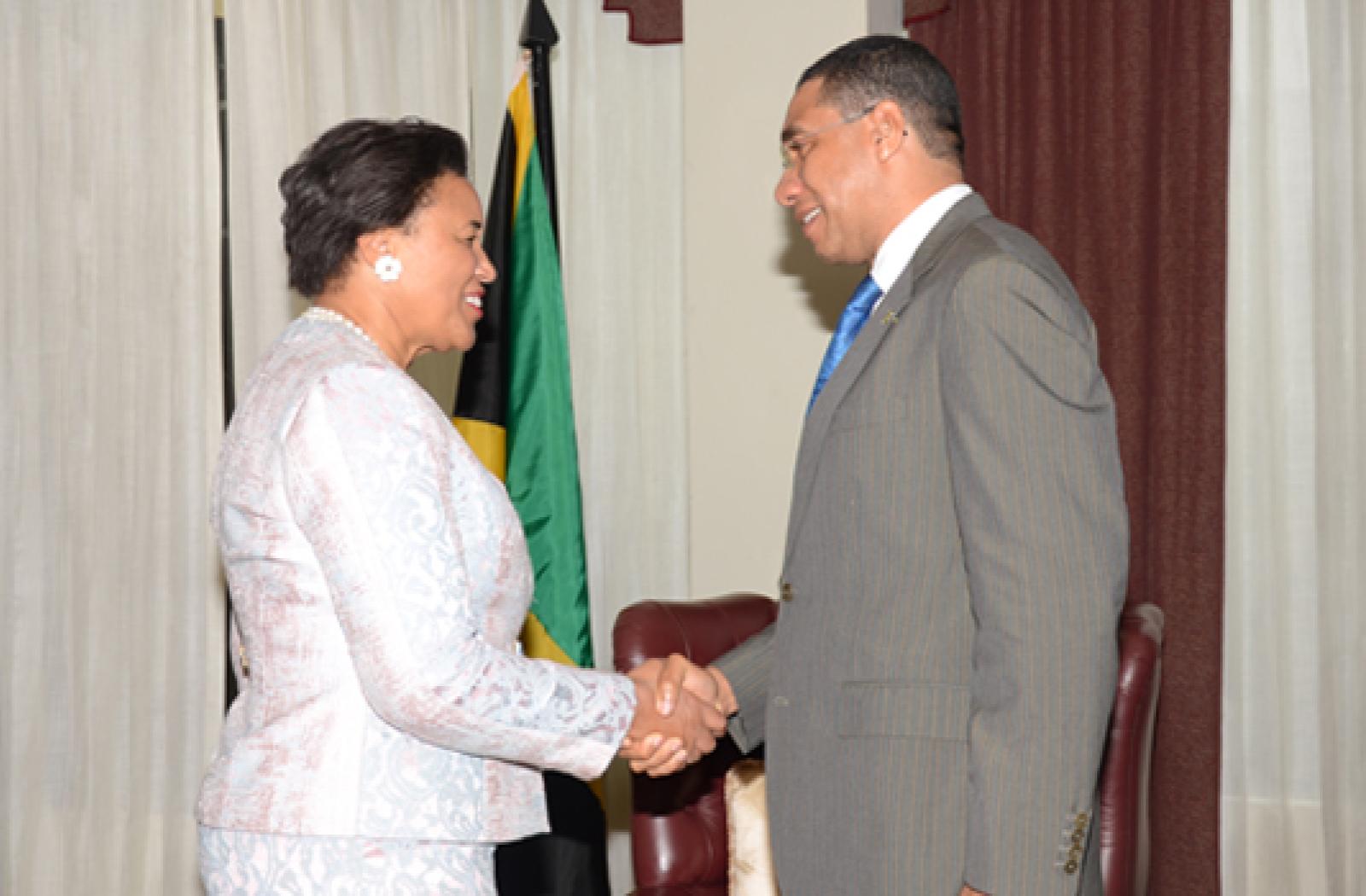 Secretary-General Scotland met with Governor General, Sir Patrick Allen, Prime Minister Andrew Holness, Speaker of the House of Representatives, Pearnel Charles, Opposition leader, Portia Simpson-Miller and Vice Chancellor of the University of the West Indies Sir Hilary Beckles. She also met with private sector and civil society representatives including Managing Director of the Gleaner Oliver Clarke and Secretary-General of Caribbean Community, Irwin LaRocque.