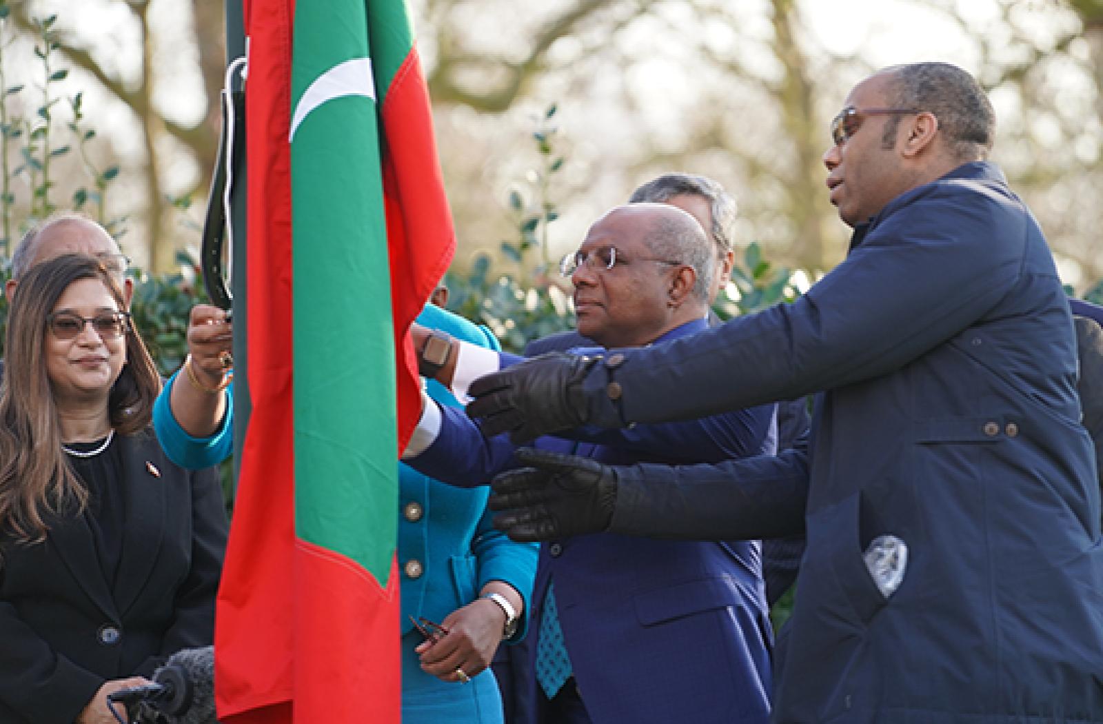 The Maldives Minister of Foreign Affairs hoisted the flag into a blue winter sky to applause and then three cheers from onlookers.