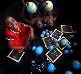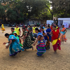 The bright colours of sari-wearing slum mothers as they experience kicking a football for the first time' by Richard Loat, Canada