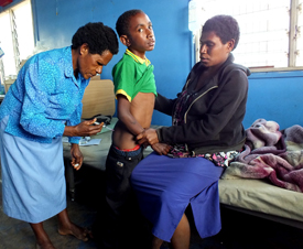 Marry Korken giving injection medication under supervision to a sick child' by Raymond Singamis, Papua New Guinea