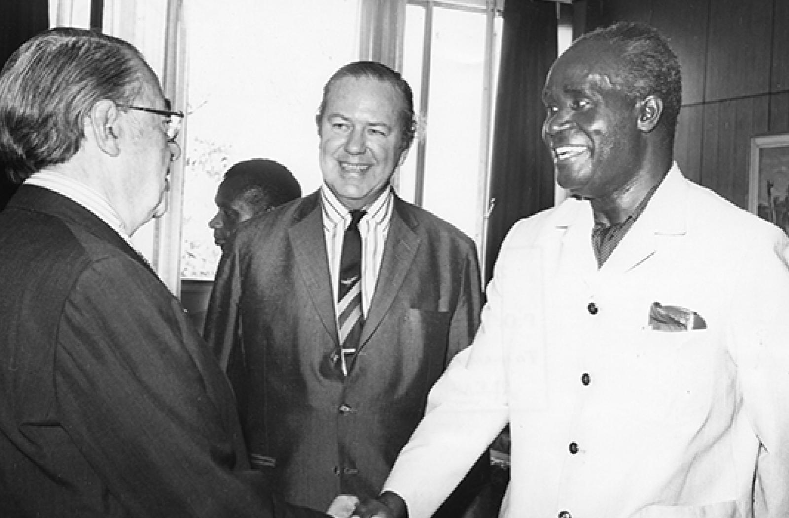Photo: President Kenneth Kaunda of Zambia greets the leaders of the Canadian delegation Senator Paul Martin as Secretary-General Arnold Smith looks on. Commonwealth Youth Ministers Meeting, Lusaka, Zambia, January 1973